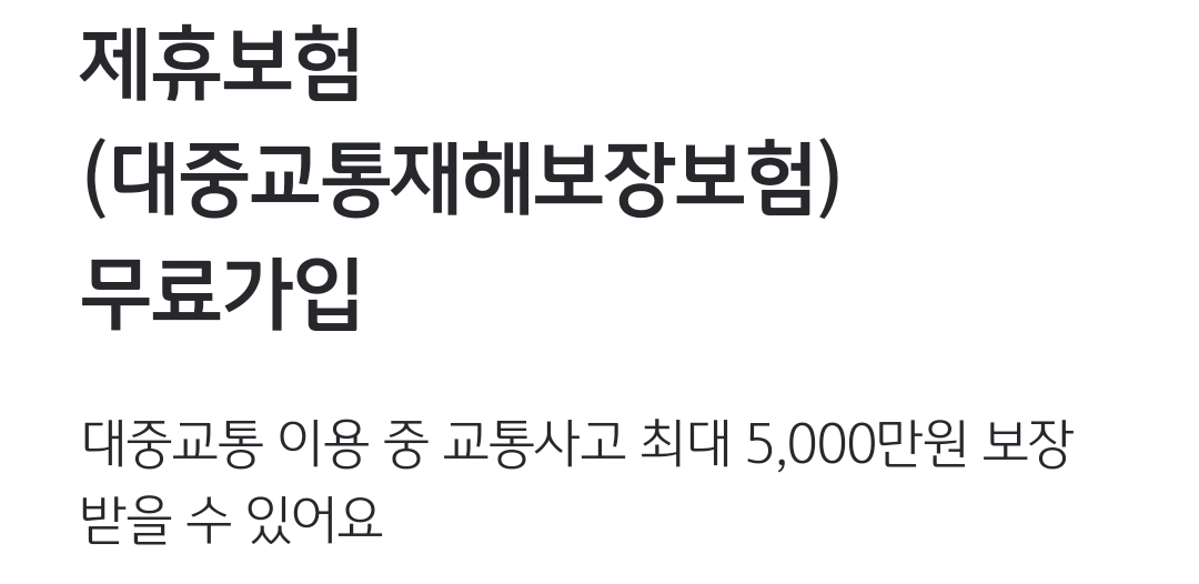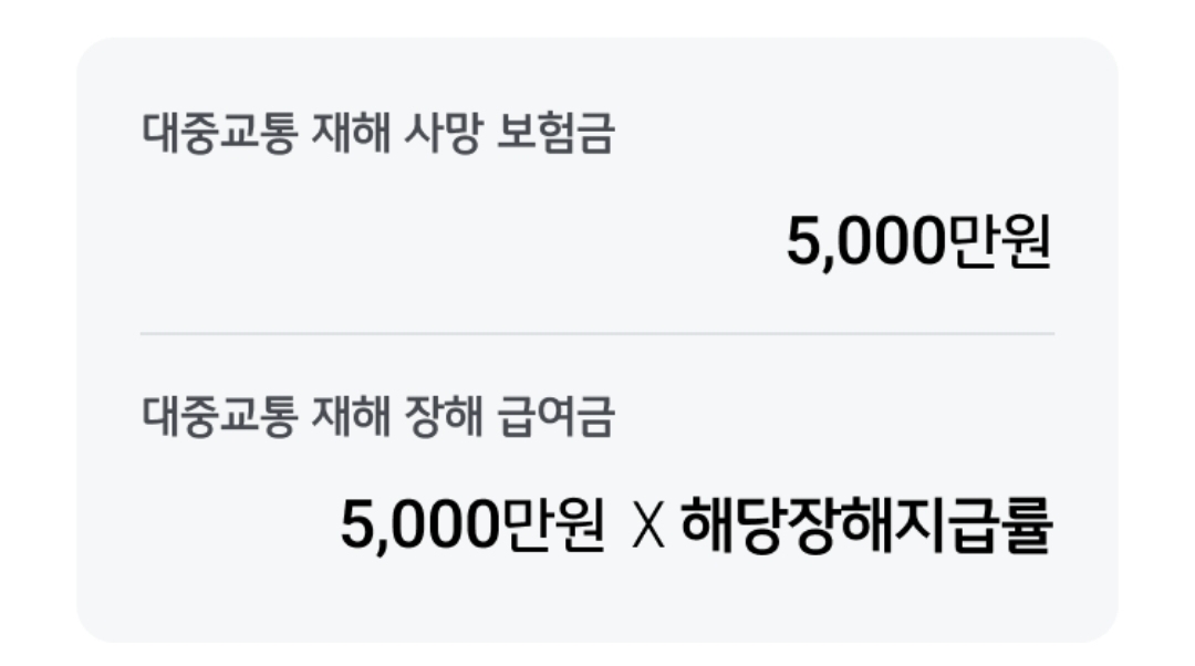 - 대중교통 이용 중 교통사고로 인한 사망과 장해를 최대 5,000만원까지 보장해 줍니다.