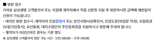 - 방문 해지 방법: 삼성생명 고객플라자에 방문하여, 주민등록증을 지참하고 신청합니다. 금액 관계없이 전액 가능합니다. 대리인 신청은 보험 계약자의 인감증명서와 인감도장, 위임장[^2^][2], 보험증권(보험가입증서), 계약자명의 통장, 대리수령인의 주민등록증이 있어야 합니다.