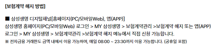 - 전화 해지 방법: 삼성생명 고객센터(1588-3114)에 전화하여, 0번 상담사 연결, 4번 보험 관련 일반 문의 후 보험 해지합니다. 해지 환급금은 5천만 원 이하 가능합니다. (평일 9시에서 오후 6시)