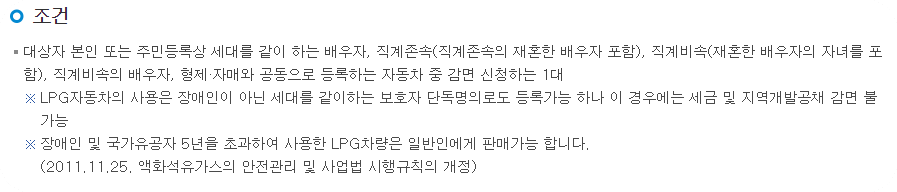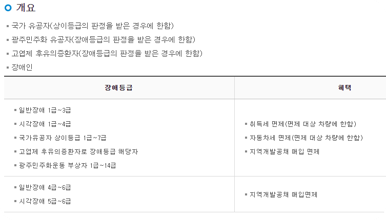 - 세금 면제: 장애인 1~3등급, 시각 장애인 1~4등급은 개별소비세, 취득세, 지역 개발 공채, 자동차세 등 다양한 세금을 면제 받을 수 있습니다. 단, 승용차는 배기량 2,000cc 이하, 승합 차는 15인승 미만, 화물차는 1톤 이하에 한해 적용됩니다. 또한 특수 장비설치비는 과세표준에서 제외됩니다.