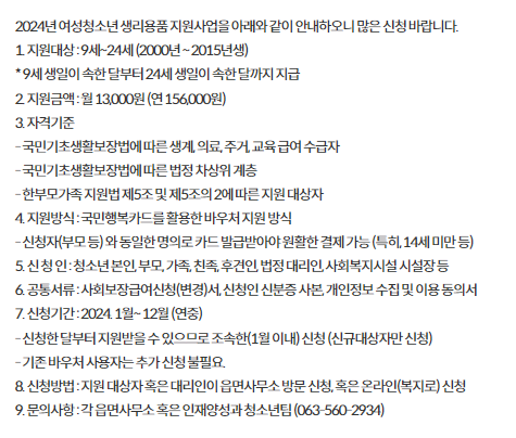 (5) 2024 여성청소년 생리용품 지원사업 신청 접수 안내 | 지자체 소식 | 기관정보 | 정부24. https://www.gov.kr/portal/locgovNews/3739744.