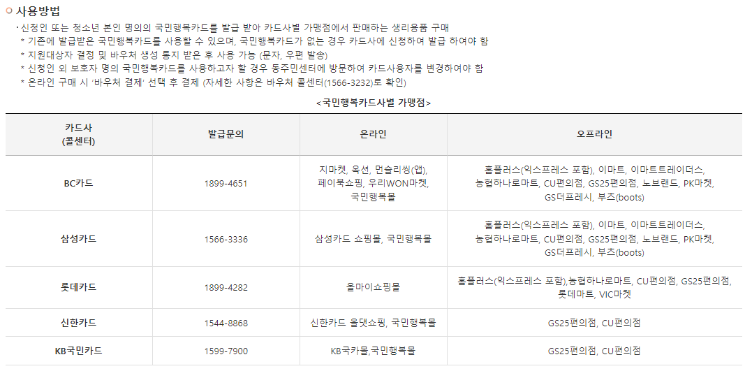 국민행복카드를 발급받아 카드사별 가맹점에서 생리용품을 구매할 수 있습니다.