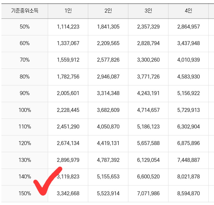 지원 대상: 신청일 기준 주민등록등본상 도봉구에 거주하며 기준 중위소득이 150% 이하인 2005년생 청년입니다. 중위 소득 150%이하는 아래의 표를 참고해주세요.