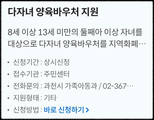 2024년 과천시에서는 8세 이상 ~ 13세 미만의 둘째아 이상 자녀를 둔 가정에게 다자녀 양육바우처를 지원합니다. 이 바우처는 아동의 자기 계발 및 진로탐색 분야로 제한하여 사용할 수 있는 지역화폐 (과천토리) 카드로 지급됩니다.