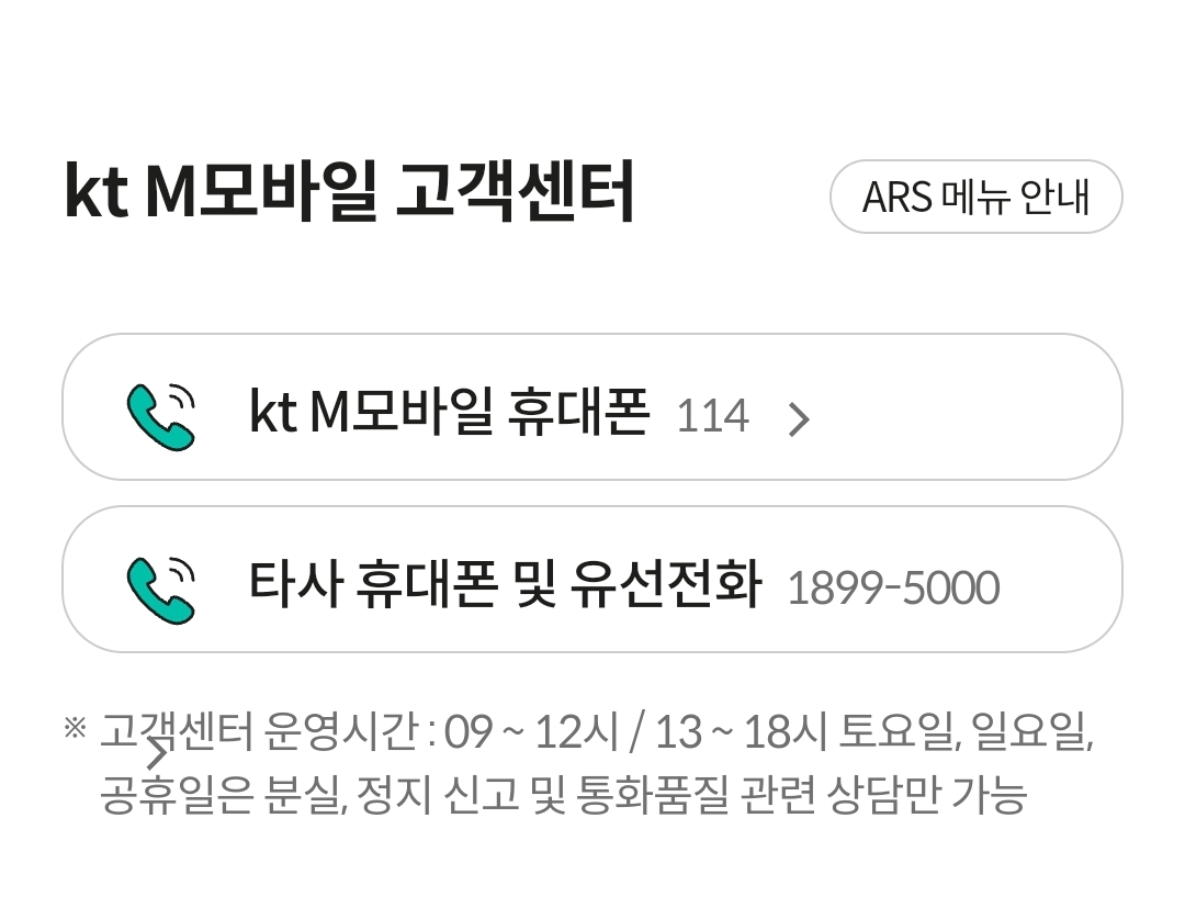 - 주말 및 공휴일에는 상담 서비스가 제한적입니다. 이 시간 동안은 분실, 정지 신고 및 통화 품질 관련 상담만 가능합니다. 점심시간인 12:00부터 13:00까지는 상담이 이루어지지 않으니 유의하시기 바랍니다.